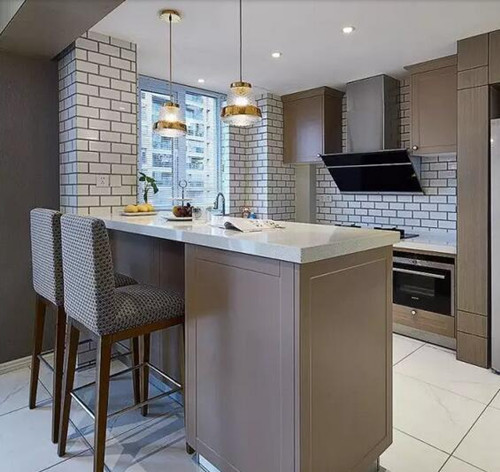 由柜子延展出来的一个吧台,自然得成为了餐桌与烹饪间的过渡。在这里来上一份下午茶也是多么有情调的事。浅灰色的橱柜与白色的台面相搭,看起来也很温润清雅。