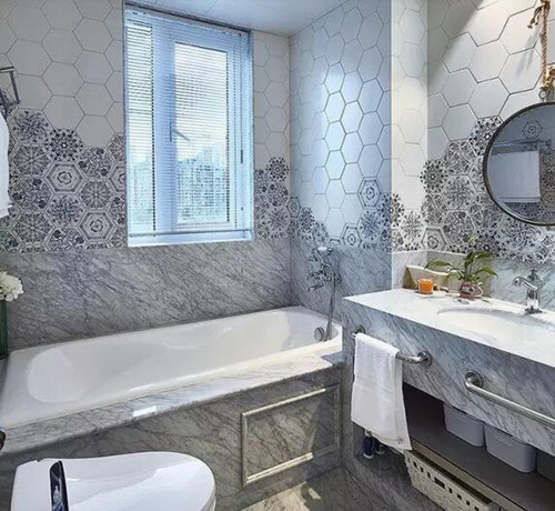 这个洗手间在花砖的点缀下,看起来很是生动清雅。主人并没有将这些花砖铺在地面,而是铺在的腰线以上的位置,混搭的图案也为这个空间增添了一份别致美。