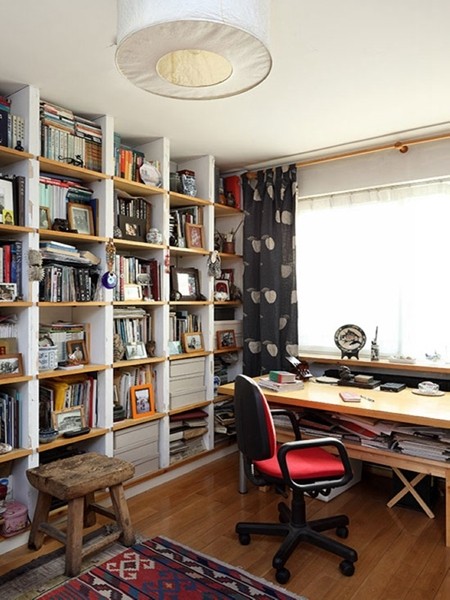 为了最大限度地开发书房的收纳功能,直通天花板的书架是最实用的,也不必担心会拿不到最上面的书,一只凳子就可以帮你解决这个问题。