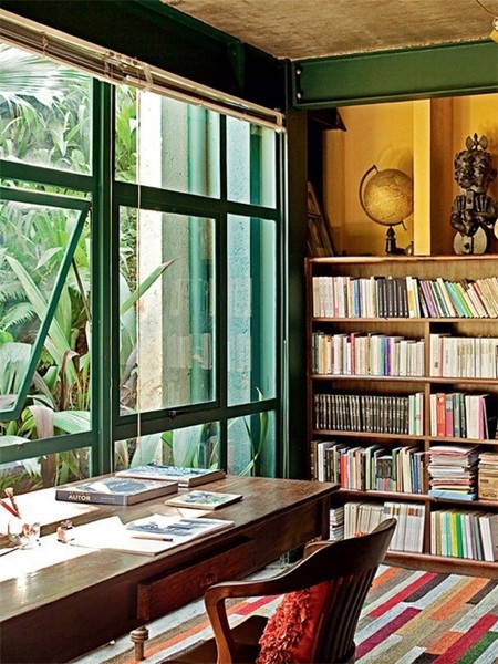 一张书桌面朝落地窗正对而坐,满眼都是绿意和阳光。墙上的内嵌式书架满足了书籍的收纳,顶层则是收藏品的展示区域。