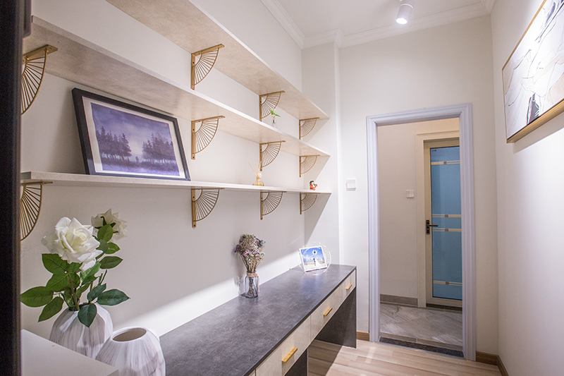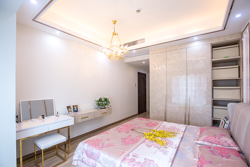 衣柜的设计摒弃了满墙式衣柜,摆脱了沉闷之感。利用床尾的空间设计了梳妆台,精致实用。