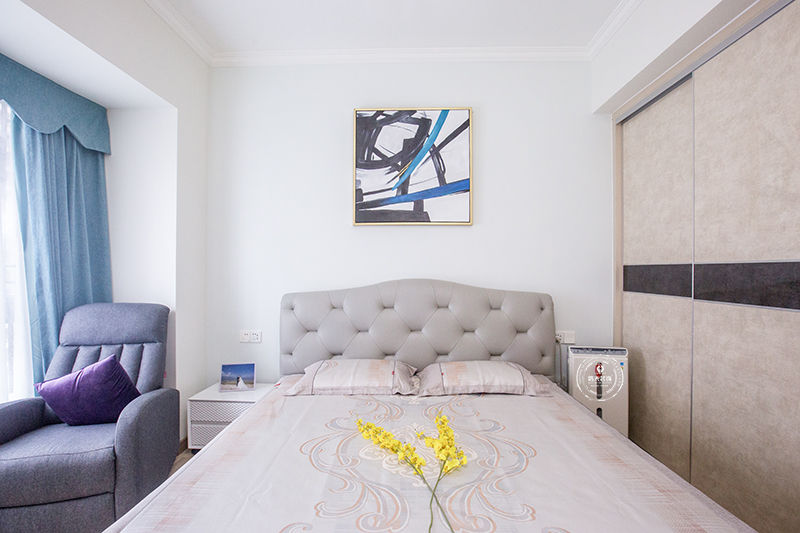 长辈房采用软包床品,加以单人沙发放在窗前做小憩之用,整个空间简洁素雅