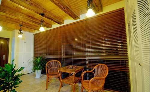 进门处的景观阳台空间比较大,设计上就跟着这样大气的节奏走,采用富有层次感的粗放木质吊顶、藤制桌椅、木质百叶大窗、铁艺吊灯,加上一些绿色盆景,整体感觉恬然又舒适。闲来在这里品品茶、聊聊天,别有一番滋味。一端的柜子是储物空间,另一侧的“柜子”里其实是间洗衣房,这样隐蔽的设计感觉实用又美观。