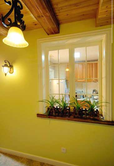 景观阳台的一边还有一扇小窗户,设计得很有特色。通过窗户可以看到厨房,增加了厨房的采光效果。另外还用了一些小盆景来点缀,以呼应整体的装饰风格。