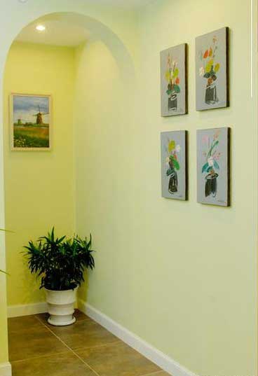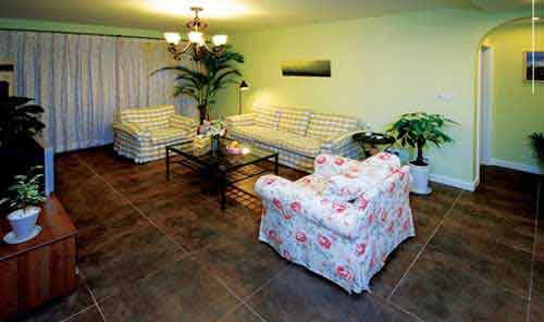 客厅则利用布艺窗帘和沙发、绿色植物来显现优雅、恬静。