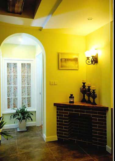 客厅旁的走道也设计了一扇拱门,与其它区域的门相呼应,并通过错层吊顶来划分区域。