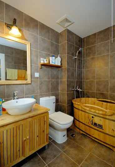 既然是美式田园风格,浴室里自然应选用与之相配的木质洁具,而且整体色调也搭配得很协调,质感很突出。