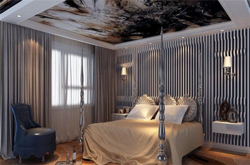 一般情况下,人们都比较重视大厅顶部的装饰,对于卧房顶部装饰则比较不讲究。其实大家只要在卧房顶部进行适当的装饰可以让整个空间更加温馨舒适,让我们身心可以得到更好的放松,图中这款天花板设计新颖时尚,具有浓郁装饰效果,现代化的图案设计使空间时尚感更加浓郁,将欧式典雅高贵气质演绎得淋漓尽致,这款天花板装修在制作上价格相对比较昂贵,主要看图案的材质选择。