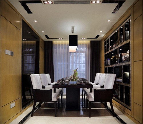 天花板不仅可以美化我们的居所,而且可以起到遮蔽梁柱、隔热、隔音的作用。图中是一个现代格调的餐厅,设计上非常的简洁时尚,具有浓郁现代时尚风格,让整个空间在视觉效果上大气时尚,整个天花板运用了统一的白色与黑色进行搭配,突出其现代时尚感,在天花板装修制作上价格一般在:30-45元之间每平米。