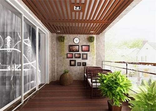阳台是属于室内和室外过渡的一块空间,阳台顶部只要稍加装饰就可以呈现出完全不同的效果。图中这款阳台采用了实木条进行装饰,在天花板上没有任何多余的装饰物,这刚好与整个阳台的装修风格非常相符合,这种现代风格可以很好营造出休闲、舒适、自然等生活氛围。实木价格比较昂贵,所以这种材质的天花板价格制作成本也会更高一些,图上这款天花板装修价格在:60-70元之间每平米。